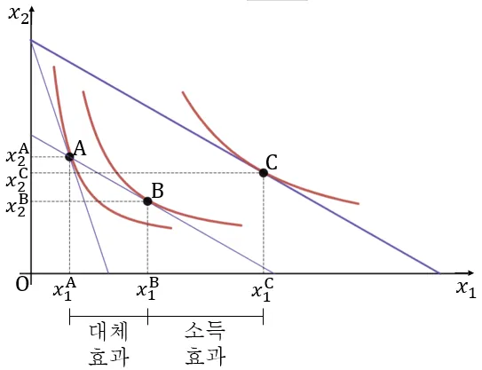 그리고 의 가격이 하락하면 소비자가 구매할 수 있는 상품 묶음 수에 변화가 생긴다. 따라서 똑같은 명목소득이어도 살 수 있는 상품의 수가 더 증가하는데, 이를 소득효과라고 한다.